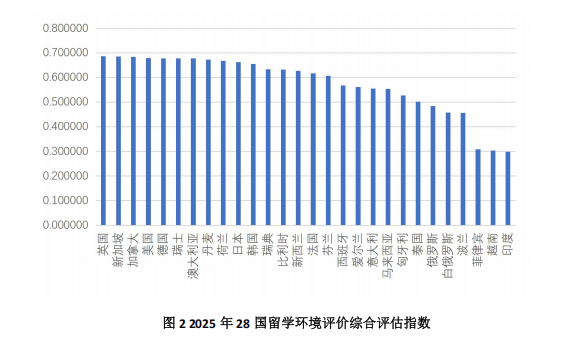 经评估分析,28个国家留学环境综合评估得分排序依次为:英国、新加坡、加拿大、美国、德国、瑞士、澳大利亚、丹麦、荷兰、日本、韩国、瑞典、比利时、新西兰、法国、芬兰、西班牙、爱尔兰、意大利、马来西亚、匈牙利、泰国、俄罗斯、白俄罗斯、波兰、菲律宾、越南、印度。