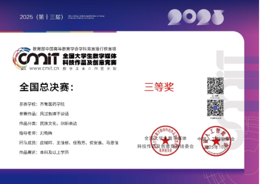 近日,2025年全国大学生数字媒体科技作品及创意竞赛全国总决赛结果揭晓。由齐鲁医药学院刘晓梅老师指导,学生团队完成的作品荣获全国三等奖。