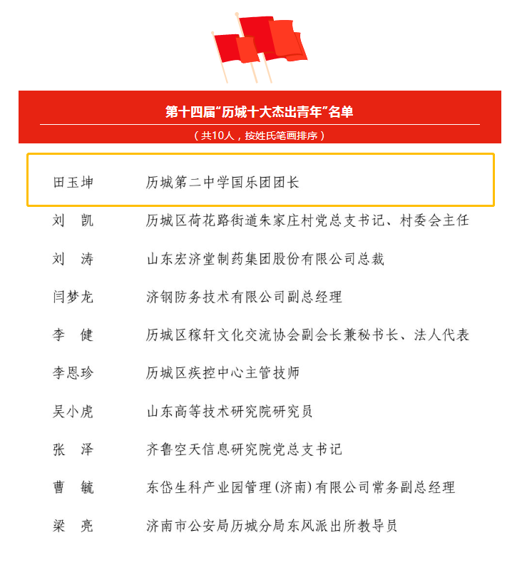历城二中田玉坤获评“历城区十大杰出青年”