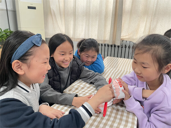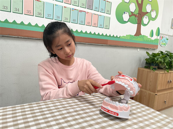 李医生还带来了牙齿模型,让队员们直观感受牙齿结构,学习正确地刷牙方法,队员们亲自动手给模型刷牙。