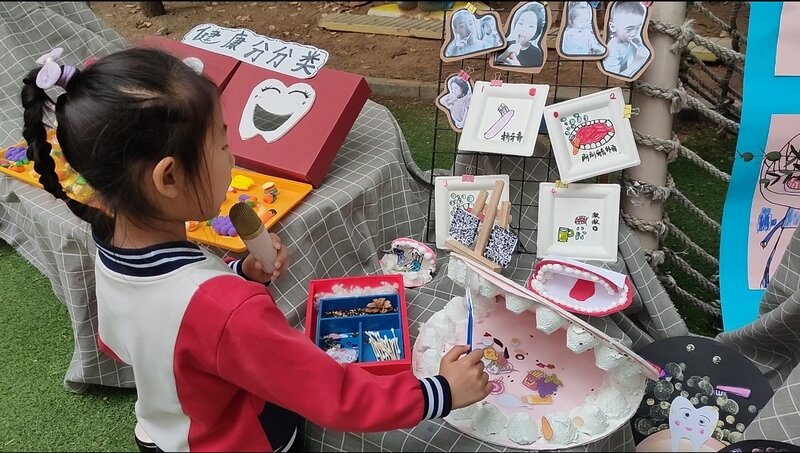 在幼儿与教师共同布置的“食品安全我知道”“牙齿的秘密”“食物旅行”等9个健康主题课程专区中,幼儿们担当起“小小讲解员”的角色,他们自信而勇敢地拿起小话筒,在每类小型版块前用稚嫩的声音介绍日常学习到的健康知识,赢得来访嘉宾们的阵阵掌声。育德幼儿园的翟雪婷老师介绍说:“让孩子们沉浸式加入到活动中,不仅可以引导他们学习健康知识,加强知识点记忆,而且还可以锻炼孩子们的语言表达和动手能力,这对于幼儿来说是一次很好的实践机会。”