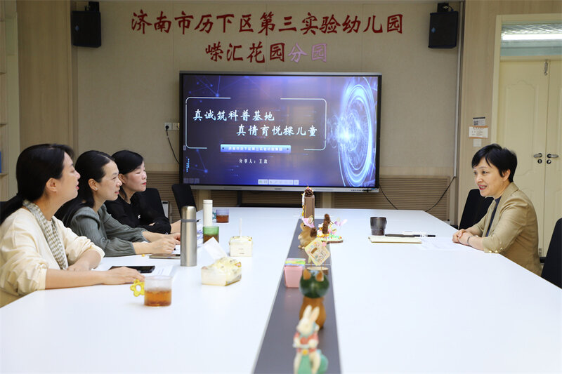 济南市历下区第三实验幼教集团党支部书记、总园长王玫首先对福建同仁来园参观表示热烈欢迎。随后沿园所科普育人的特色主线,以“真诚筑科普基地 真情育悦探儿童”为题从育人体系建设、组织架构搭建、常态机制设立、发展规划布局等方面介绍园所科普工作的发展脉络。