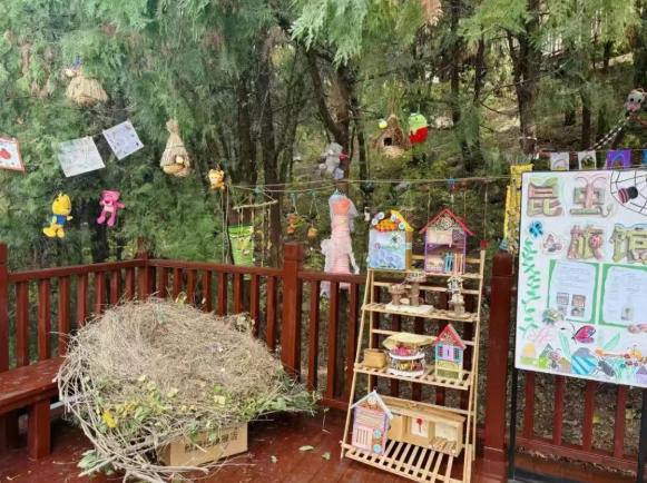 拾级而上,童趣与创意在山间流淌。孩子们打造的“星光与记忆”展区,源于课后“不舍山野暮色”的纯真心愿。仿荷花的灵动造型、藏童真的云朵模样,还有巧用山坡木棍、松果制成的手工路灯,既展现着动手能力,更将环保守护的种子悄悄埋下。“我和大山坡的故事”摄影展上,镜头定格着“快乐时光”的嬉戏活力、“秋日的礼物”的自然之美、“大山坡小卫士”的责任担当,文字与画面交织,记录着孩子们与自然的深度对话。山路蜿蜒,惊喜次第绽放。形态各异的鸟窝与昆虫之家散落林间,枯木、松果、枯枝搭建的“自然居所”,是孩子们循着益虫与鸟类生活轨迹送上的温馨馈赠。小小讲解员穿梭其间,稚嫩却清晰的声音,传递着实践的快乐与探索的热忱。