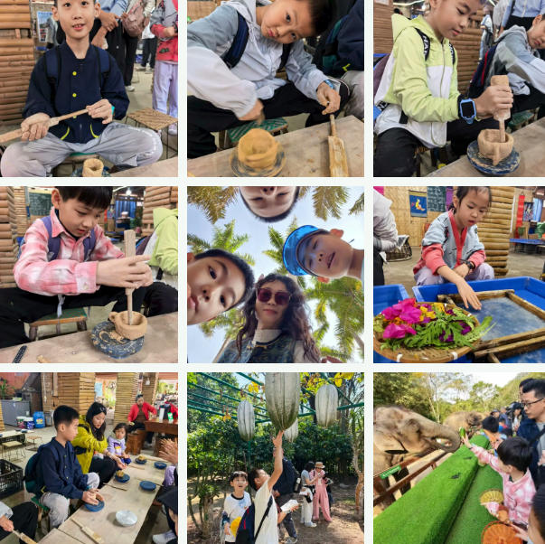 接下来的几日,成长共同体的家庭们始终并肩同行,逐一探访西双版纳的特色景点,收获满满。在中科院勐仑植物园,大家沉浸式观赏各类珍稀植物,亲眼见到课本中提及的大板根、绞杀植物等自然奇观,真切感受大自然的神奇与壮阔;在热带花卉园,亲子携手参与水果采摘活动,亲手摘下新鲜的热带果实,在劳作中体会收获的喜悦。之后,大家走进曼听御花园,孩子们拿起画笔,将傣家风情与热带美景定格在画纸之上;随后前往般若寺,在静谧祥和的氛围中,享受属于共同体大家庭的温馨时光。