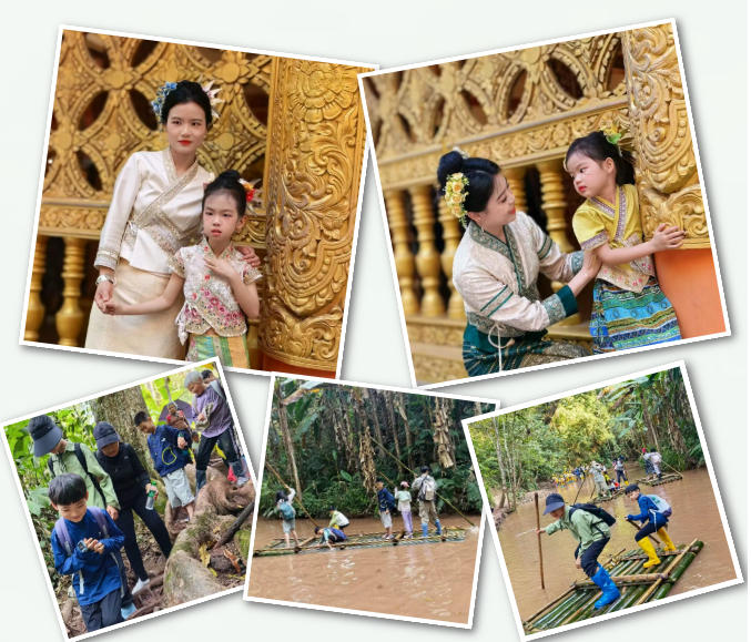 2月4日,成长共同体的参与家庭齐聚机场,带着满心期待告别济南的冬日,一同搭乘航班奔赴祖国西南边疆。2月5日,共同体全体家庭精神饱满地一同乘车前往基诺山,开启了意义非凡的雨林徒步实践活动。在专业导师的细致引导下,家长与孩子们相互搀扶、彼此鼓励,穿梭在郁郁葱葱的原始雨林中,认识各类珍稀动植物,学习芭蕉取水、搭建庇护所等野外生存技能,勇敢挑战攀树等特色项目,还一同品尝了原生态的基诺族雨林大餐。随后,大家前往千年傣寨曼掌村,跟随非物质文化遗产代表性传承人亲身体验造纸、制陶等传统技艺,在动手实践中近距离感受傣族文化的独特魅力,也让成长共同体的凝聚力在互动中悄然提升。