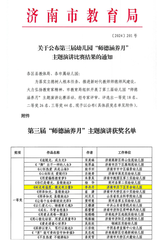 历下区百合幼儿园着力打造“德行宽厚 学养深厚 务崇温厚”的教师团队,积极组织教师参加济南市第三届幼儿园“师德涵养月”主题演讲比赛活动。