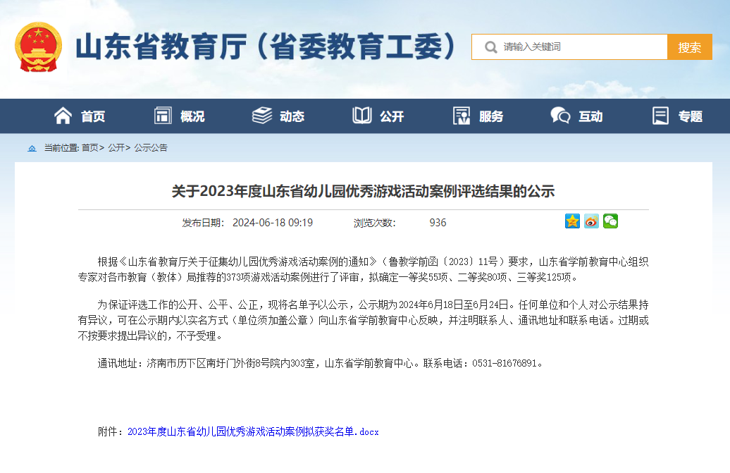 济南市历下区百合幼儿园提报的《来,荡秋千喽》在373项案例中脱颖而出,荣获山东省幼儿园优秀游戏活动案例一等奖,这也是历下区属幼儿园中的唯一获奖案例。