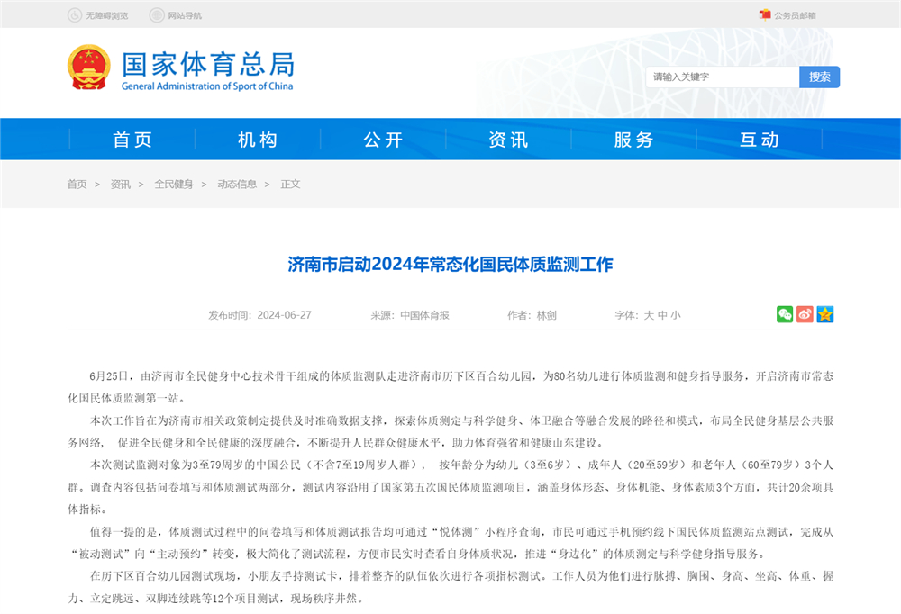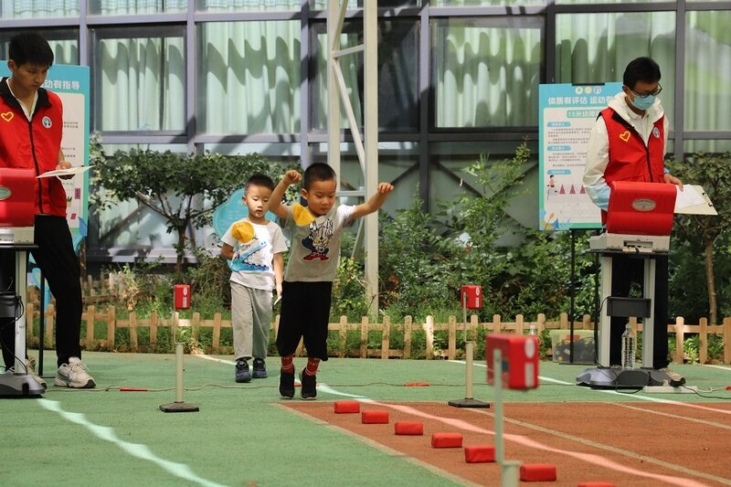 由济南市全民健身中心技术骨干组成的体质监测队走进济南市历下区百合幼儿园,现场抽取80名幼儿进行体质监测和健身指导服务,开启济南市国民体质监测第一站。