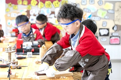 4月27日,江苏省南通市通州区实验幼儿园的孩子们在体验木工制作。翟慧勇 摄