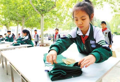 4月27日,在山东省滨州市博兴县第四届小学生劳动技能大赛赛场,学生在参加叠衣服生活技能比赛。陈彬 摄